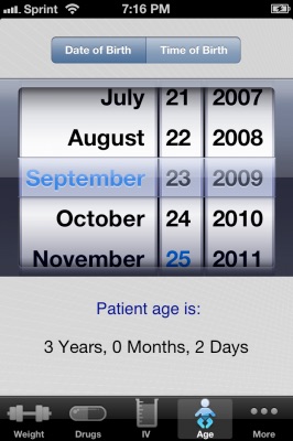 The “IV” category at the bottom quickly calculates a fluid bolus and maintenance fluid rate based on the patient’s weight. The “weight” category at the bottom can also be used as a calculator, particularly for weight changes over time. This will obviously be very useful in dehydrated patients, in the newborn nursery, or during the first week or two of life when weight loss in infants is especially important. These calculators combined with the dosing function make this app useful for pediatricians who prefer to rely on one or two apps that will perform multiple functions. However, this app could be improved by expanding the drug list and listing more side effects.