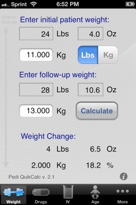 7. Breastfeeding Management 2 ($1.99). Although most of the information on this app is useful for the novice pediatrician or support staff, the calculator section is simple and straightforward. The weight-loss calculator is probably the most useful function, as weights in the office are often recorded in pounds, which makes it difficult to calculate the percent weight loss without a calculator. This app can calculate the percent weight change using either pounds or kilograms.