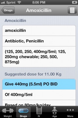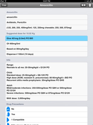 • Take into account the patient's age when giving a suggested dose on the drug screen. The suggested dose is based on the entered weight, but not the age. For example, I entered weight information for a 1 month old, and the suggested dosing of Amoxicillin was 80 mg/kg/day.
