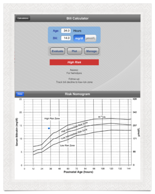 In my opinion, the most valuable function is the bili calculator. It saves me the trouble of pulling out my old laminated risk nomograms. You enter the baby's age and bilirubin level, and the app displays the risk zone and plots the bilirubin on the AAP risk or phototherapy nomograms. It can also display the decision-making algorithm.