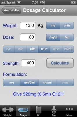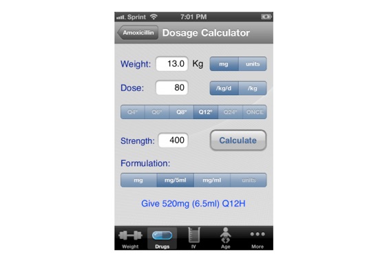 3. Pedi QuikCalc (free). This app is perfect for those who prefer a less-detailed version of Epocrates, but who desire calculations done instantly. Several features are quite helpful. First, by entering the child’s weight and selecting the medication, the app will automatically calculate the correct dose. The app displays how it arrived at this dose in mg/kg and lists all of the available concentrations.