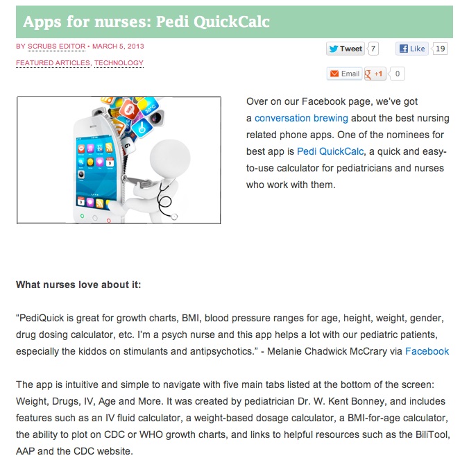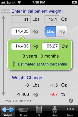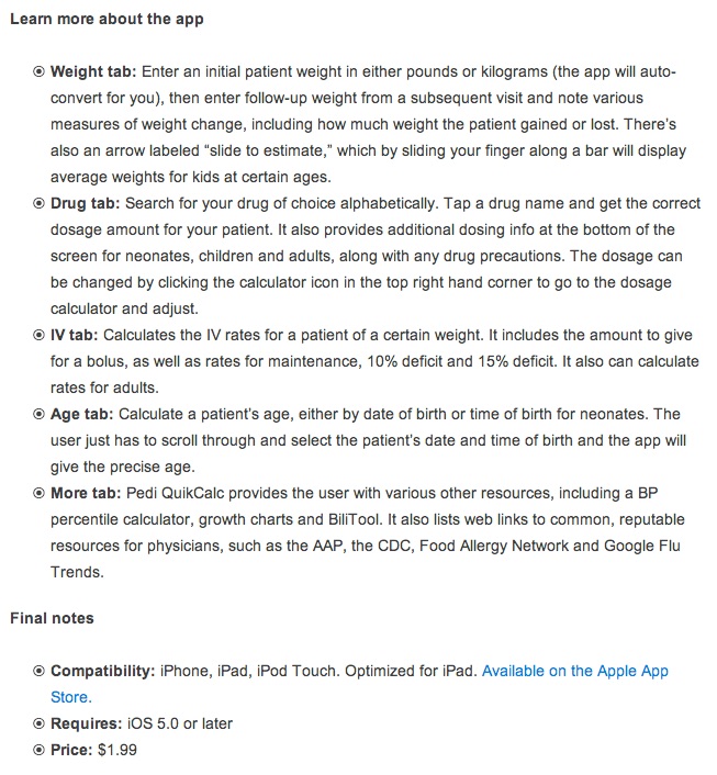 Pedi QuikCalc works well on both devices. The only negative about the iPhone app is the navigation. It takes an extra click to get to the bili tool, BMI calculator and growth charts.