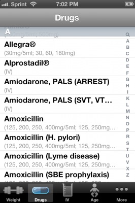 The next main tab is Drugs. From this screen you can quickly search for your drug of choice alphabetically. If my 30-month-old patient also had otitis media at this visit and I wanted to give amoxicillin, I could easily find the right dose by tapping its name on the list.
