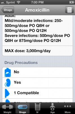 This app will also list whether or not the drug is approved for use in pregnancy and breast-feeding, or if adjustments must be made for renal impairment. The drug list itself is not nearly as all-inclusive as in Epocrates, but is sufficient for most circumstances.