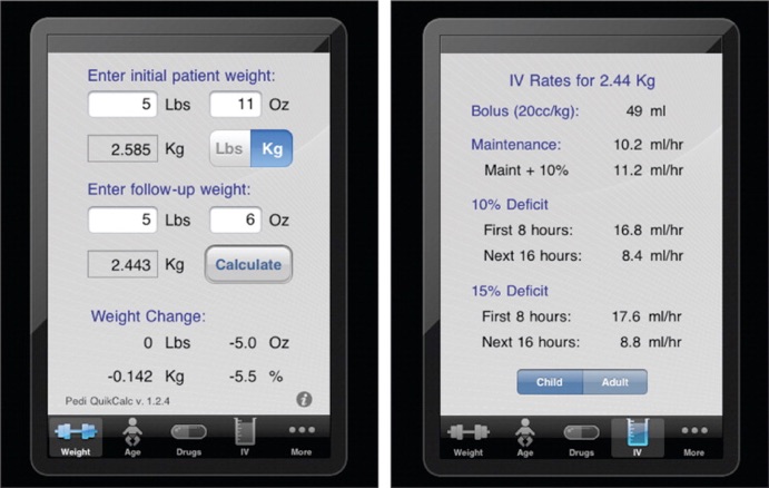 The IV rate calculator is the one function that seems out-of-place, as it is the only clear inpatient-based tool. It suggests recommended maintenance, bolus and fluid replacement rates based on the child's weight. While this is useful information to have in some situations, it is incongruous with the otherwise pediatric outpatient and newborn nursery tools and data.