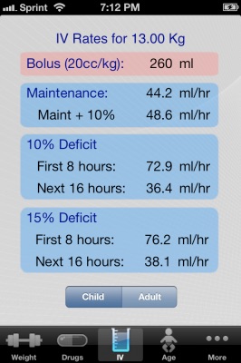 The next section of the app, IV, is simple and self-explanatory. It calculates the IV rates for a patient of a certain weight (in this case the same 13 kg child). It includes the amount to give for a bolus, as well as rates for maintenance, 10% deficit, and 15% deficit. It also can calculate rates for adults.