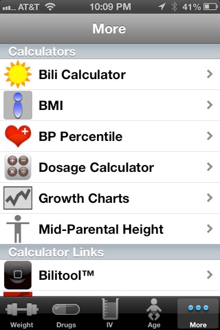 Finally, under the More tab, Pedi QuikCalc provides the user with various other resources, including a BP percentile calculator, growth charts, and BiliTool.