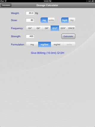 The dosage calculator is great for calculating weight-based medications for which you already know the dosing. The default is the weight that was initially entered on opening the app.